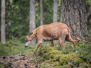 Ja mitä tapahtui viimeisinä tiineysvuorokausina? Perjantaina käytiin metsälenkillä, Häsä vuoron perään leikki kävyillä ja etsi pesimispaikkoja. :D Perjantaina sen lämpö oli 37,4-37,5 useamman tunnin ajan, mikä oli edeltäviä päiviä selkeästi matalampi jo. Edelleen se söi hyvin, joi normaalia enemmän ja makasi pentulaatikossaan täysin rauhallisena. Se oli iloinen, häntää heiluttava itsensä.